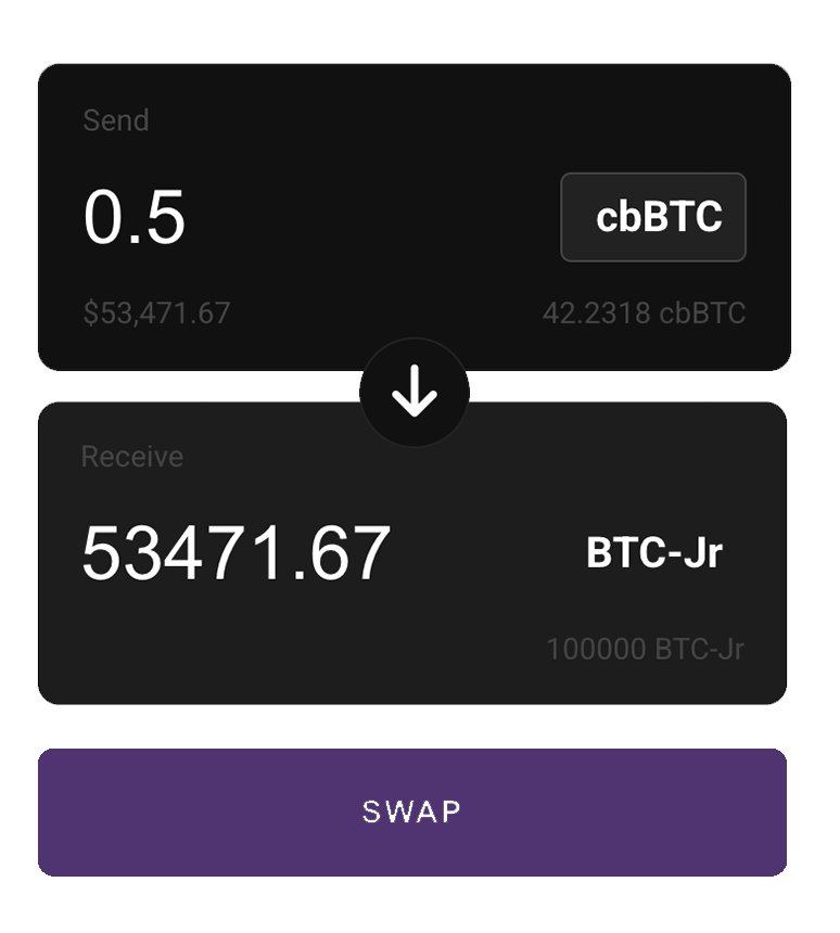 You don’t need to be a professional trader to use BTC-Jr. Just swap cbBTC for it and swap back whenever. No margin, strikes, or maturities.
