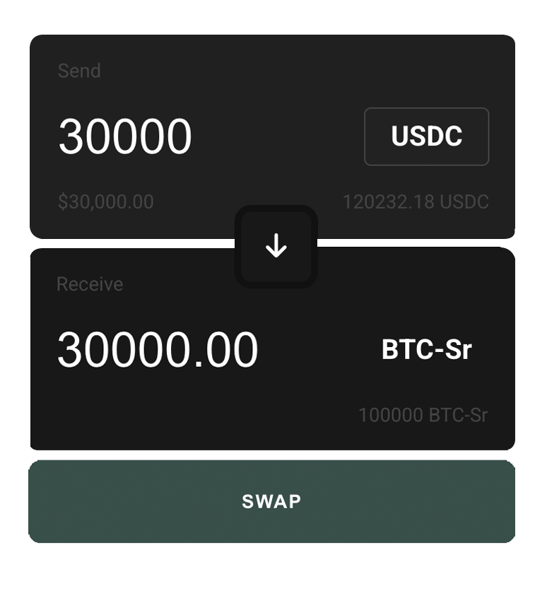 Swap USDC for BTC-Sr — a Bitcoin-backed stable asset that automatically carries yield. Swap back whenever you want.